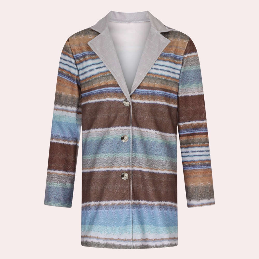 Kombinasjonen av komfort og moteriktig design gjør denne lange cardiganen ikke bare til et varmt lag, men også til et statement-plagg. Med sitt myke, strikkede stoff gir den varme og komfort, mens de flerfargede horisontale stripene skaper et moderne og eklektisk utseende.