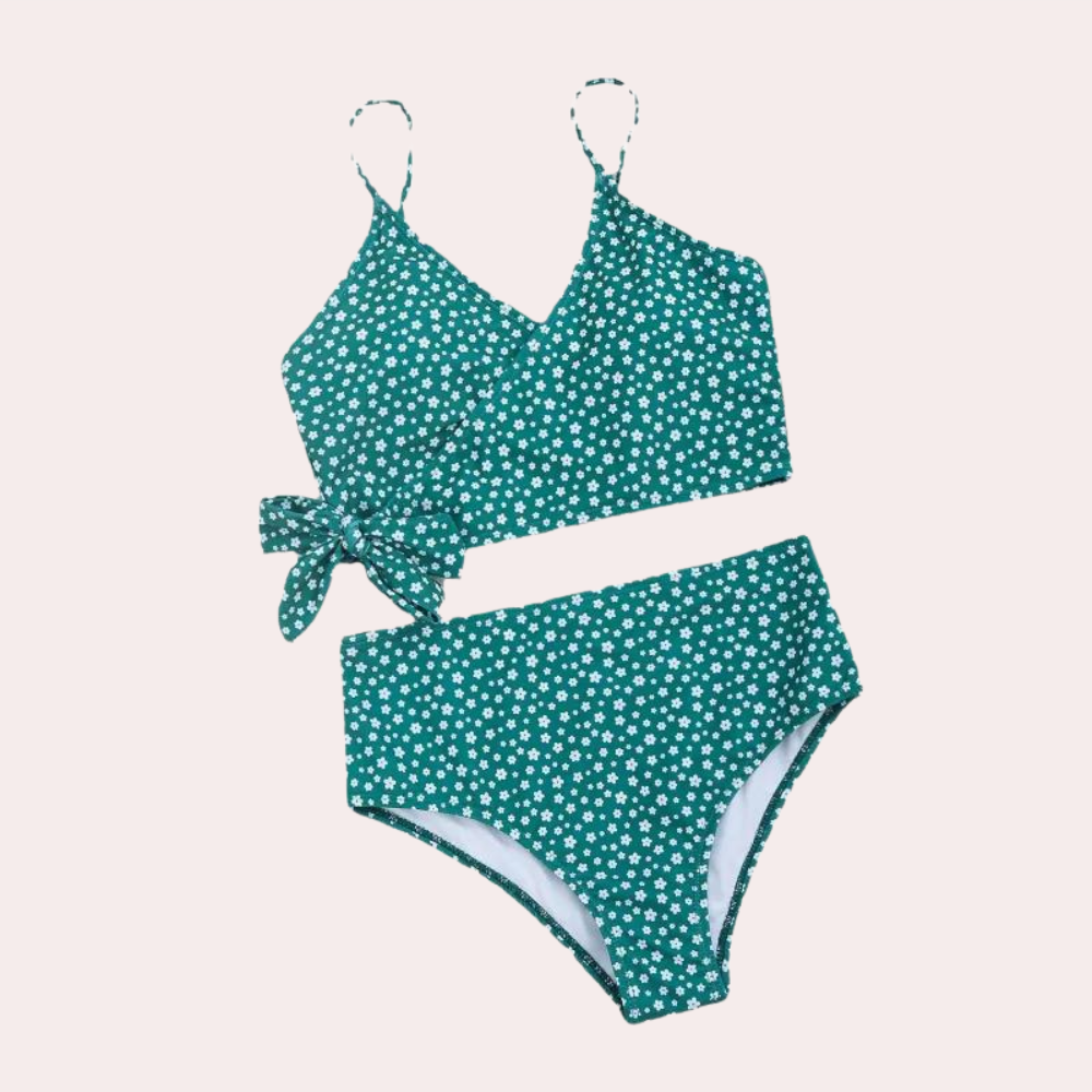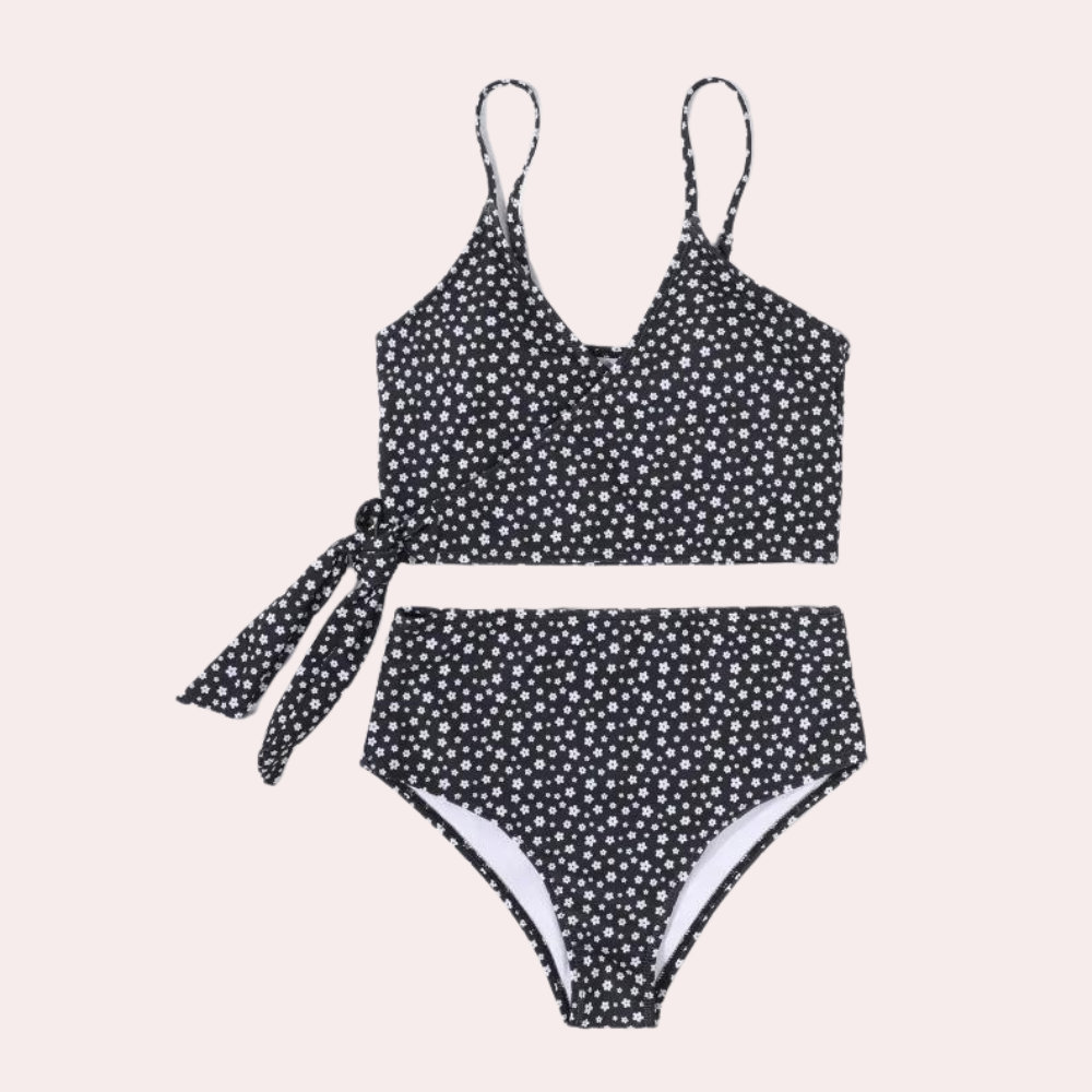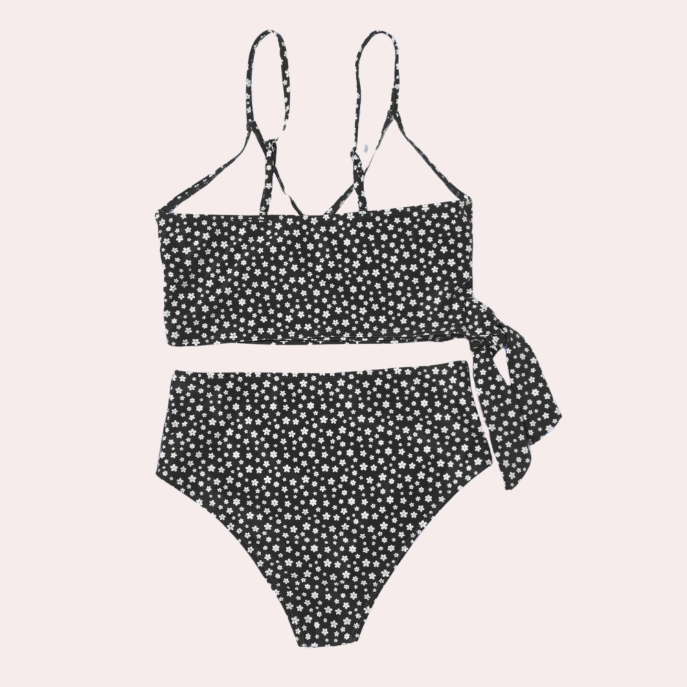 Lag et plask i vårt Ilona Blomstrete bikinisett for kvinner, et retroinspirert ensemble som er like lekent som det er stilig. Dette sjarmerende bikinisettet med klassisk blomstertrykk gir strandlooken din en touch av vintage. Det er laget av stretchstoff av høy kvalitet og garanterer komfort og holdbarhet hele dagen. Enten du slapper av ved bassenget eller nyter havets bølger, vil dette bikinisettet få deg til å se elegant og selvsikker ut.