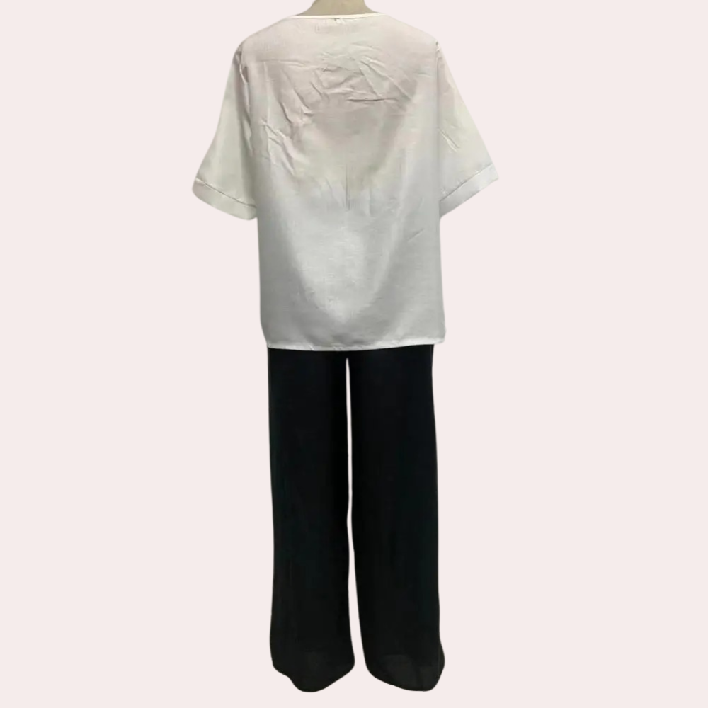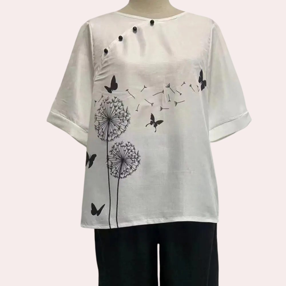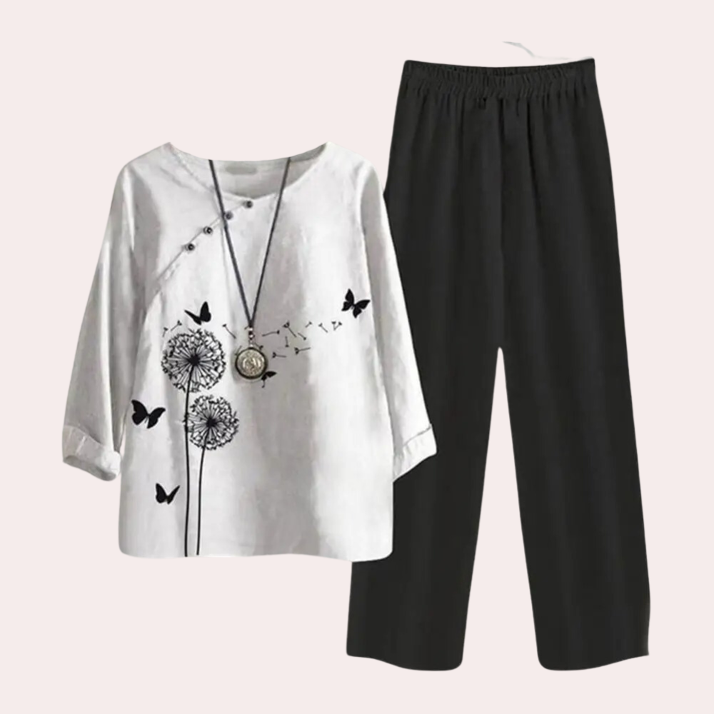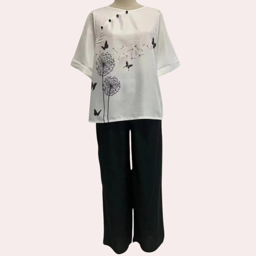 Riha Komfortabel Topp og Bukser for Den Moderne Kvinne, dekorert med et sjarmerende løvetann- og sommerfuglmotiv, symboliserer frihet og eleganse. Laget av materialer av høy kvalitet, kombinerer dette settet komfort med et sofistikert utseende som fremhever din naturlige skjønnhet og gir deg en selvtillitsboost.