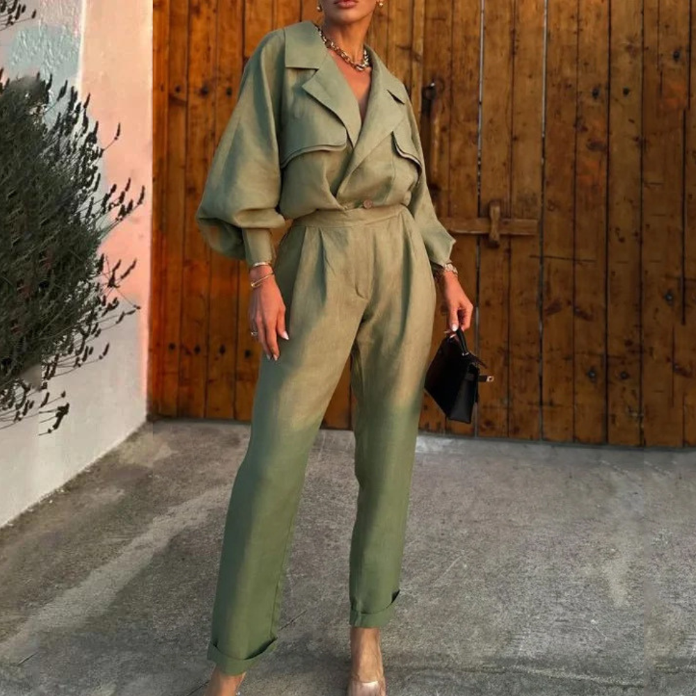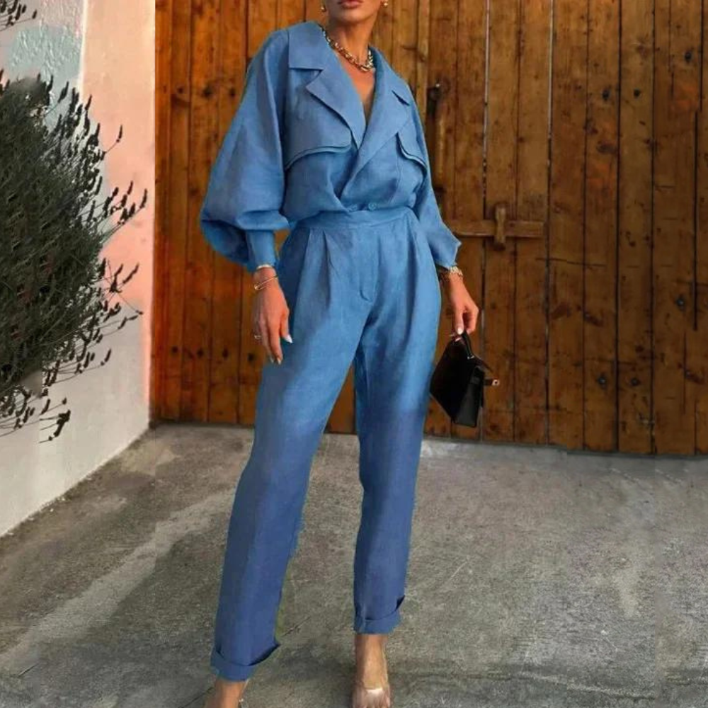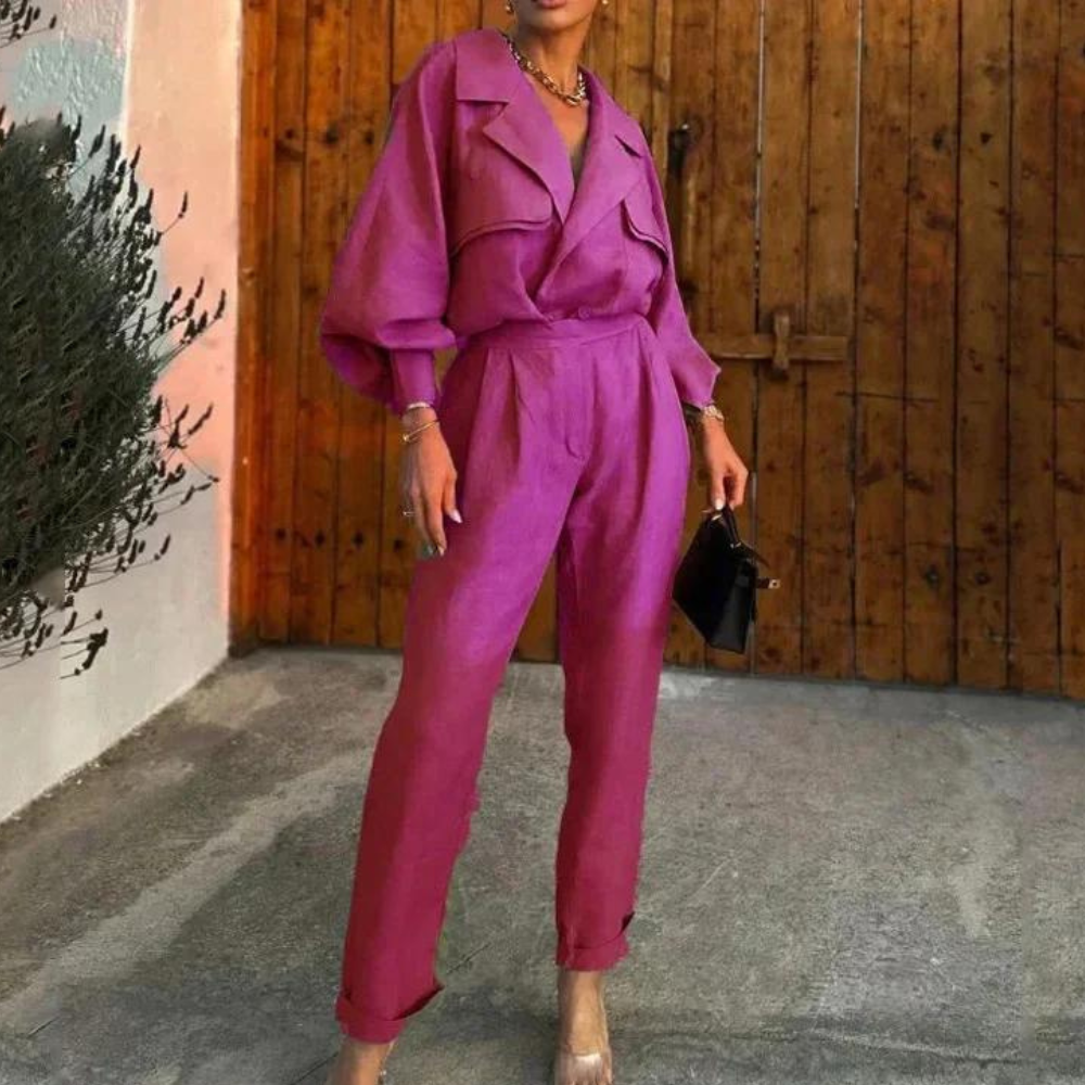 Ta utfordringen og kombiner denne stilige, dristige, high fashion-blazeren med den matchende langermede jakken og de lange buksene. Det perfekt skreddersydde ensemblet kombinerer eleganse og avslappethet i en tidløs, sofistikert look som passer til alle anledninger - enten det er på kontoret, i møte med venner eller til en spesiell kveld. Enten de brukes hver for seg eller som et sett, er disse plaggene et must-have i enhver garderobe og gir et stilig og personlig preg til ethvert antrekk.