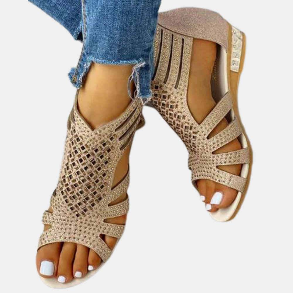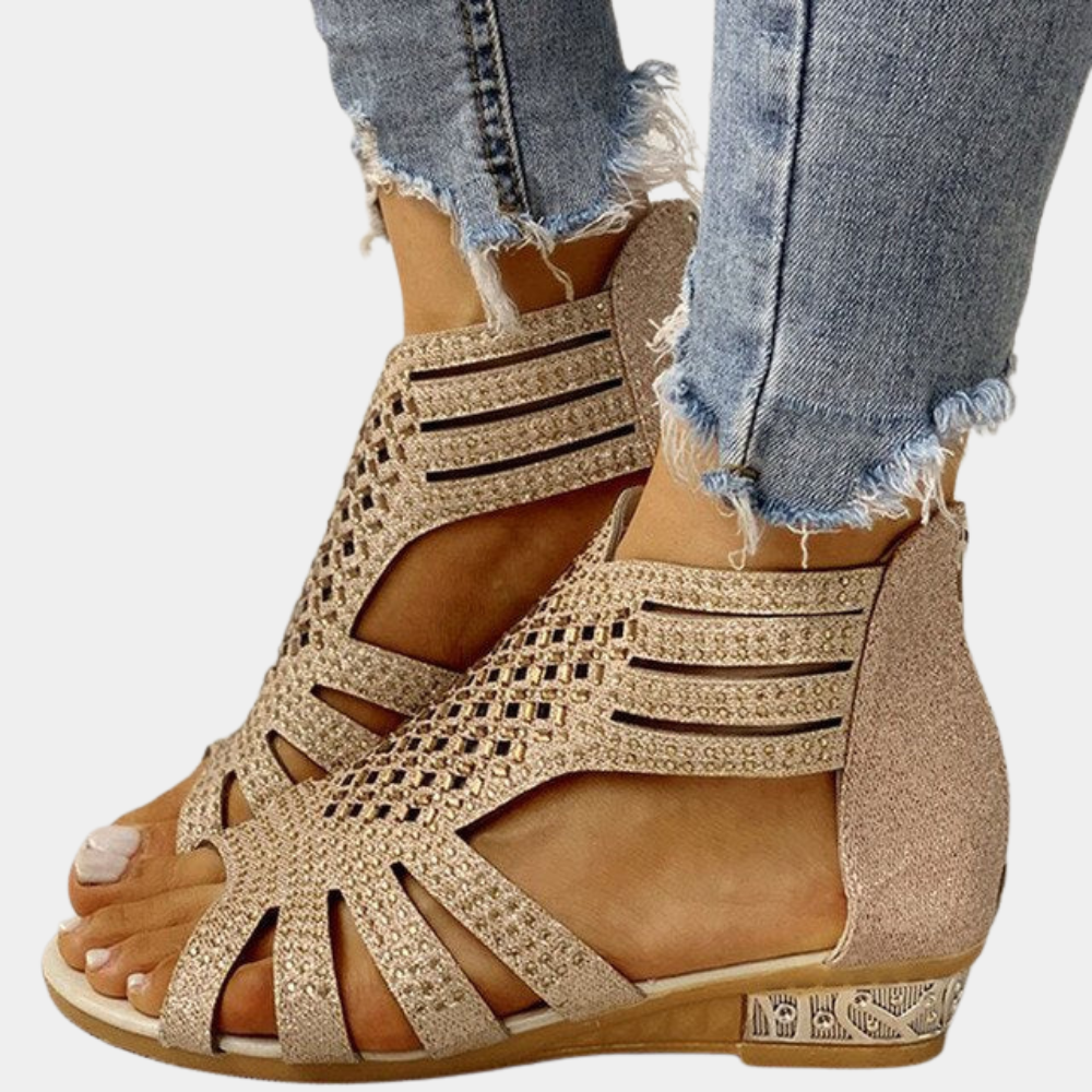 Det glitrende utseendet har nylig fått stor oppmerksomhet i moteverdenen, og disse sandalene fremhever denne stilen. De er åpne sandaler med en rekke moteriktige utskjæringsmotiver på skoene. Hælkappen har en lang glidelås som gjør det enkelt å ta skoene av og på. Glidelåsen sikrer også at skoene sitter godt når de bæres. Glitrende detaljer er påført materialet, og de har en liten kilehæl.